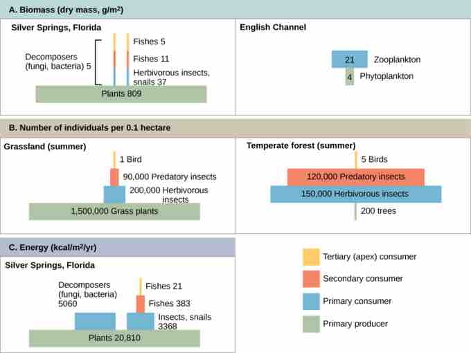 Ecological pyramids depict the (a) biomass, (b) number of organisms, and (c) energy in each trophic level.