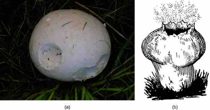 The (a) giant puff ball mushroom releases (b) a cloud of spores when it reaches maturity.