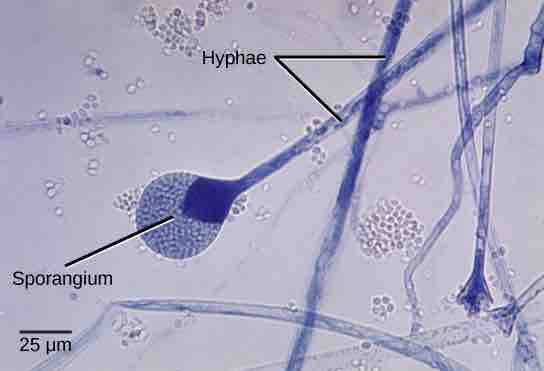 This bright field light micrograph shows the release of spores from a sporangium at the end of a hypha called a sporangiophore. The organism depicted is a Mucor sp. fungus: a mold often found indoors.