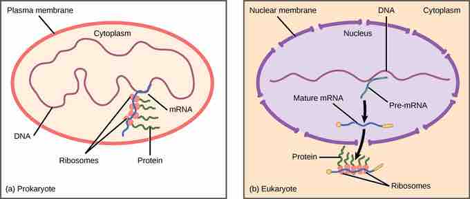Prokaryotic organisms are single-celled organisms that lack a defined nucleus; therefore, their DNA floats freely within the cell cytoplasm. To synthesize a protein, the processes of transcription (DNA to RNA) and translation (RNA to protein) occur almost simultaneously. When the resulting protein is no longer needed, transcription stops. Thus, the regulation of transcription is the primary method to control what type of protein and how much of each protein is expressed in a prokaryotic cell. All of the subsequent steps occur automatically. When more protein is required, more transcription occurs. Therefore, in prokaryotic cells, the control of gene expression is mostly at the transcriptional level.