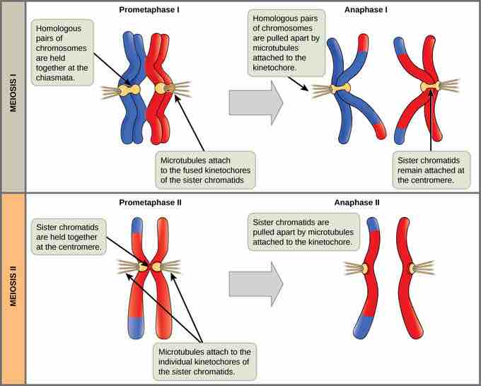 The process of chromosome alignment differs between meiosis I and meiosis II. In prometaphase I, microtubules attach to the fused kinetochores of homologous chromosomes, and the homologous chromosomes are arranged at the midpoint of the cell in metaphase I. In anaphase I, the homologous chromosomes are separated. In prometaphase II, microtubules attach to the kinetochores of sister chromatids, and the sister chromatids are arranged at the midpoint of the cells in metaphase II. In anaphase II, the sister chromatids are separated.