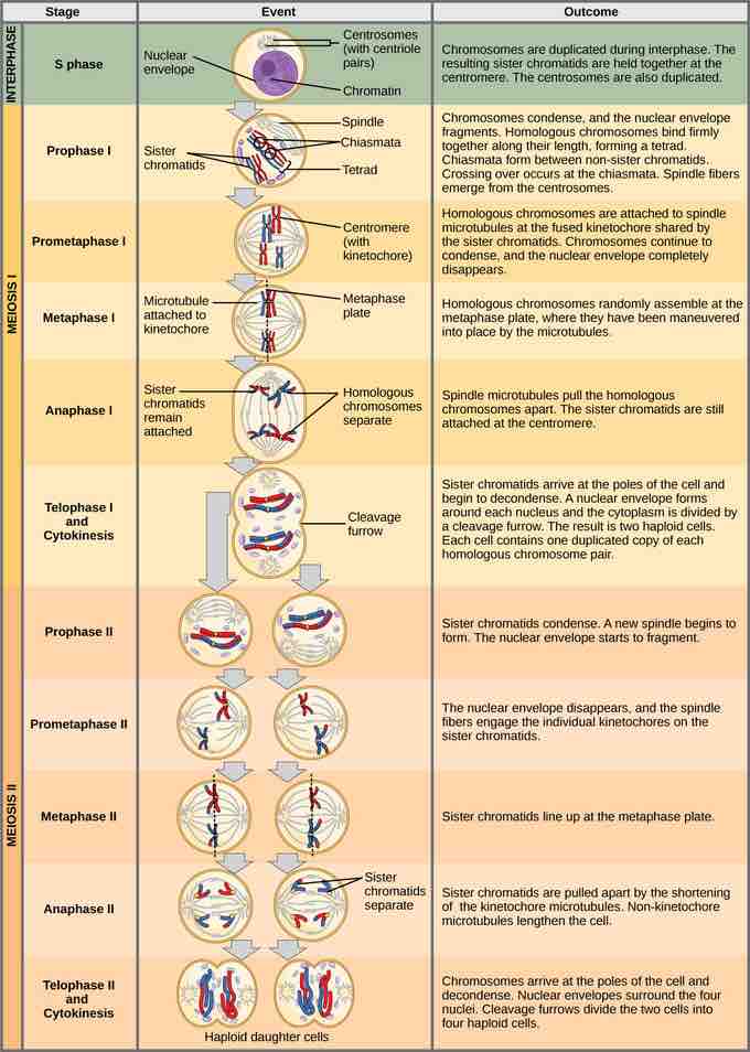 The chromosomes arrive at opposite poles and begin to decondense. Nuclear envelopes form around the chromosomes. Cytokinesis separates the two cells into four unique haploid cells. At this point, the newly-formed nuclei are both haploid. The cells produced are genetically unique because of the random assortment of paternal and maternal homologs and because of the recombining of maternal and paternal segments of chromosomes (with their sets of genes) that occurs during crossover .