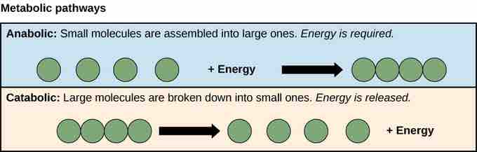 Anabolic pathways are those that require energy to synthesize larger molecules. Catabolic pathways are those that generate energy by breaking down larger molecules. Both types of pathways are required for maintaining the cell's energy balance.