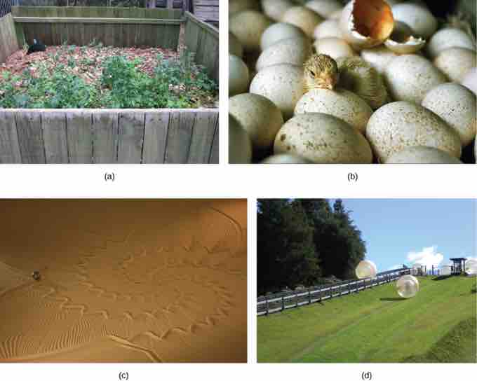 Shown are some examples of endergonic processes (ones that require energy) and exergonic processes (ones that release energy). These include (a) a compost pile decomposing, (b) a chick hatching from a fertilized egg, (c) sand art being destroyed, and (d) a ball rolling down a hill.