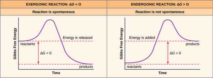 If energy is released during a chemical reaction, then the resulting value from the above equation will be a negative number. In other words, reactions that release energy have a ∆G < 0. A negative ∆G also means that the products of the reaction have less free energy than the reactants because they gave off some free energy during the reaction. Reactions that have a negative ∆G and, consequently, release free energy, are called exergonic reactions. Exergonic means energy is exiting the system. These reactions are also referred to as spontaneous reactions because they can occur without the addition of energy into the system. Understanding which chemical reactions are spontaneous and release free energy is extremely useful for biologists because these reactions can be harnessed to perform work inside the cell. An important distinction must be drawn between the term spontaneous and the idea of a chemical reaction that occurs immediately. Contrary to the everyday use of the term, a spontaneous reaction is not one that suddenly or quickly occurs. The rusting of iron is an example of a spontaneous reaction that occurs slowly, little by little, over time.