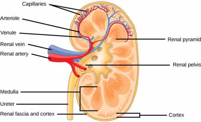 Externally, the kidneys are surrounded by three layers . The outermost layer, the renal fascia, is a tough connective tissue layer. The second layer, the perirenal fat capsule, helps anchor the kidneys in place. The third and innermost layer is the renal capsule. Internally, the kidney has three regions: an outer cortex, a medulla in the middle, and the renal pelvis in the region called the hilum of the kidney. The hilum is the concave part of the bean-shape where blood vessels and nerves enter and exit the kidney; it is also the point of exit for the ureters.