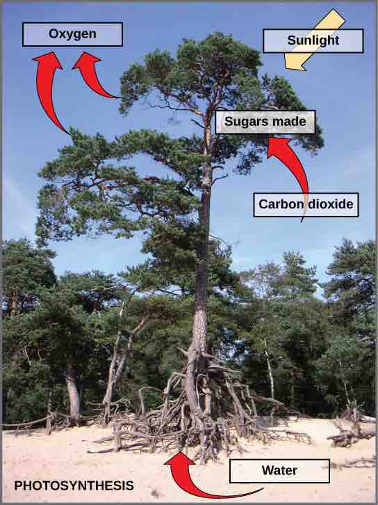 Photosynthesis uses solar energy, carbon dioxide, and water to produce energy-storing carbohydrates. Oxygen is generated as a waste product of photosynthesis.