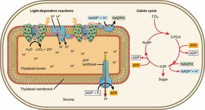 Light-dependent reactions harness energy from the sun to produce chemical bonds, ATP, and NADPH. These energy-carrying molecules are made in the stroma where the Calvin cycle takes place. The Calvin cycle is not totally independent of light since it relies on ATP and NADH, which are products of the light-dependent reactions.