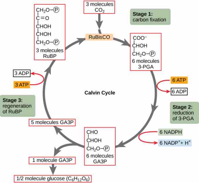 The Calvin cycle has three stages. In stage 1, the enzyme RuBisCO incorporates carbon dioxide into an organic molecule, 3-PGA. In stage 2, the organic molecule is reduced using electrons supplied by NADPH. In stage 3, RuBP, the molecule that starts the cycle, is regenerated so that the cycle can continue. Only one carbon dioxide molecule is incorporated at a time, so the cycle must be completed three times to produce a single three-carbon GA3P molecule, and six times to produce a six-carbon glucose molecule.