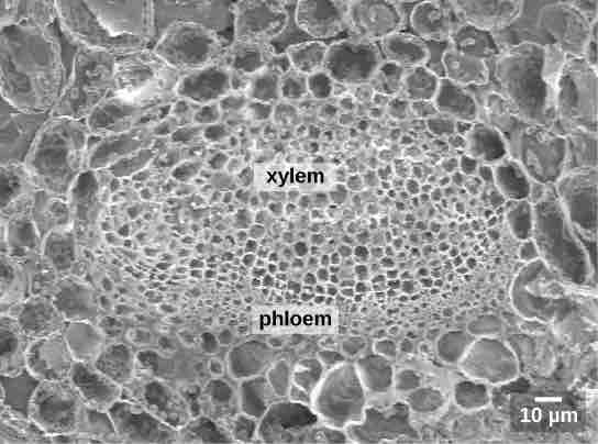 This scanning electron micrograph shows xylem and phloem in the leaf vascular bundle.