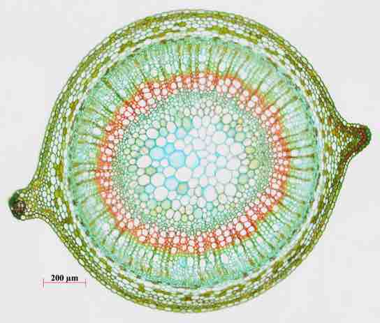 The stem of common St John's Wort (Hypericum perforatum) is shown in cross section in this light micrograph. The central pith (greenish-blue, in the center) and peripheral cortex (narrow zone 3–5 cells thick, just inside the epidermis) are composed of parenchyma cells. Vascular tissue composed of xylem (red) and phloem tissue (green, between the xylem and cortex) surrounds the pith.