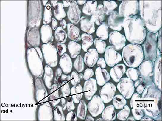 Collenchyma cell walls are uneven in thickness, as seen in this light micrograph. They provide support to plant structures.