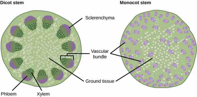 In (a) dicot stems, vascular bundles are arranged around the periphery of the ground tissue. The xylem tissue is located toward the interior of the vascular bundle; phloem is located toward the exterior. Sclerenchyma fibers cap the vascular bundles. In (b) monocot stems, vascular bundles composed of xylem and phloem tissues are scattered throughout the ground tissue.