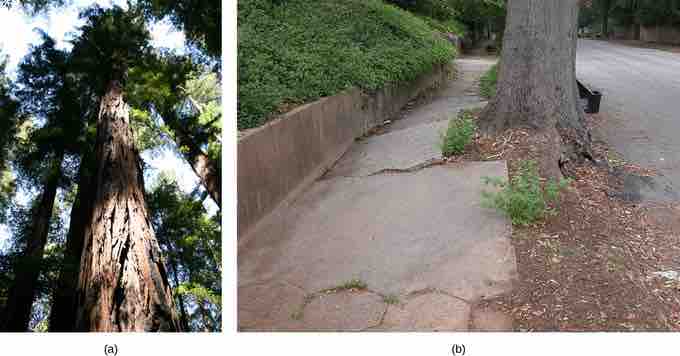 With heights nearing 116 meters, (a) coastal redwoods (Sequoia sempervirens) are the tallest trees in the world. Plant roots can easily generate enough force to (b) buckle and break concrete sidewalks.