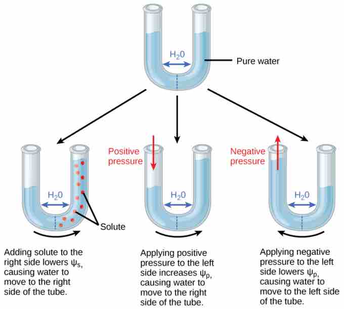 In this example with a semipermeable membrane between two aqueous systems, water will move from a region of higher to lower water potential until equilibrium is reached. Solutes (Ψs), pressure (Ψp), and gravity (Ψg) influence total water potential for each side of the tube (Ψtotal right or left) and, therefore, the difference between Ψtotal on each side (Δ). (Ψm , the potential due to interaction of water with solid substrates, is ignored in this example because glass is not especially hydrophilic). Water moves in response to the difference in water potential between two systems (the left and right sides of the tube).