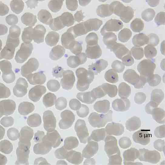 Red blood cells are shown to be infected with P. falciparum, the causative agent of malaria. In this light microscopic image taken using a 100× oil immersion lens, the ring-shaped P. falciparum stains purple.