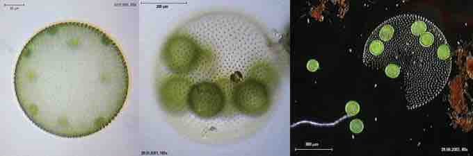 The chlorophyte Volvox is one of only a few examples of a colonial organism, which behaves in some ways like a collection of individual cells, but in other ways like the specialized cells of a multicellular organism . Volvox colonies contain 500 to 60,000 cells, each with two flagella, contained within a hollow, spherical matrix composed of a gelatinous glycoprotein secretion. Individual Volvox cells move in a coordinated fashion and are interconnected by cytoplasmic bridges. Only a few of the cells reproduce to create daughter colonies, an example of basic cell specialization in this organism.