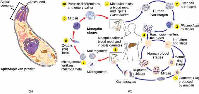 (a) Apicomplexans are parasitic protists. They have a characteristic apical complex that enables them to infect host cells. (b) Plasmodium, the causative agent of malaria, has a complex life cycle typical of apicomplexans.