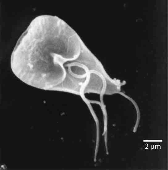 The mammalian intestinal parasite Giardia lamblia, visualized here using scanning electron microscopy, is a waterborne protist that causes severe diarrhea when ingested.
