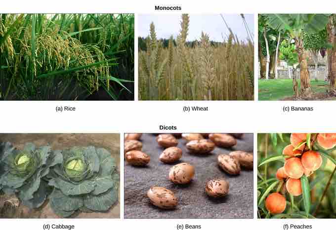 The world's major crops are flowering plants. (a) Rice, (b) wheat, and (c) bananas are monocots, while (d) cabbage, (e) beans, and (f) peaches are dicots.