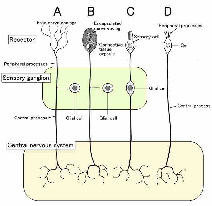Structure of four different types of sensory receptors found within the sensory system.