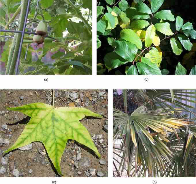 Nutrient deficiency is evident in the symptoms these plants show. This (a) grape tomato suffers from blossom end rot caused by calcium deficiency. The yellowing in this (b) Frangula alnus results from magnesium deficiency. Inadequate magnesium also leads to (c) intervenal chlorosis, seen here in a sweetgum leaf. This (d) palm is affected by potassium deficiency.