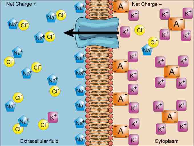 Simple concentration gradients are differential concentrations of a substance across a space or a membrane, but in living systems, gradients are more complex. Because ions move into and out of cells and because cells contain proteins that do not move across the membrane and are mostly negatively charged, there is also an electrical gradient, a difference of charge, across the plasma membrane. The interior of living cells is electrically negative with respect to the extracellular fluid in which they are bathed. At the same time, cells have higher concentrations of potassium (K+) and lower concentrations of sodium (Na+) than does the extracellular fluid. In a living cell, the concentration gradient of Na+ tends to drive it into the cell, and the electrical gradient of Na+ (a positive ion) also tends to drive it inward to the negatively-charged interior. The situation is more complex, however, for other elements such as potassium. The electrical gradient of K+, a positive ion, also tends to drive it into the cell, but the concentration gradient of K+ tends to drive K+ out of the cell. The combined gradient of concentration and electrical charge that affects an ion is called its electrochemical gradient .