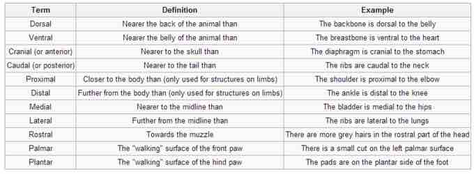 The table illustrates common directional terms that are used to describe the position of body parts in relation to other body parts.