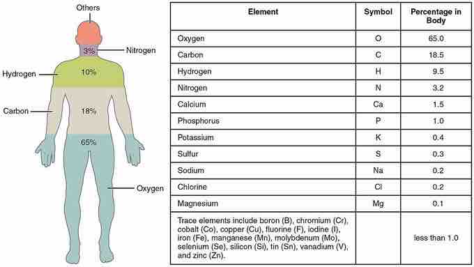 There are 25 elements believed to play an active role in human health. Carbon, hydrogen, oxygen, and nitrogen make up approximately 96% of the mass in a human body.