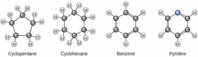 Carbon can form five-and six membered rings. Single or double bonds may connect the carbons in the ring, and nitrogen may be substituted for carbon.