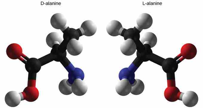 D-alanine and L-alanine are examples of enantiomers or mirror images. Only the L-forms of amino acids are used to make proteins.