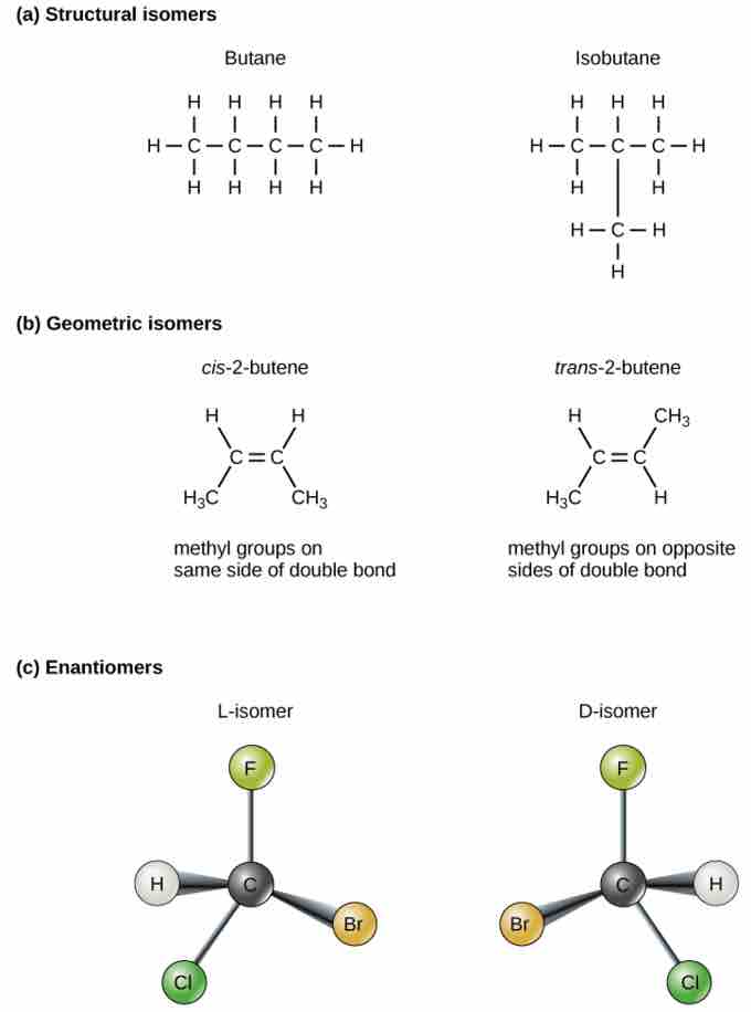 Molecules that have the same number and type of atoms arranged differently are called isomers. (a) Structural isomers have a different covalent arrangement of atoms. (b) Geometric isomers have a different arrangement of atoms around a double bond. (c) Enantiomers are mirror images of each other.