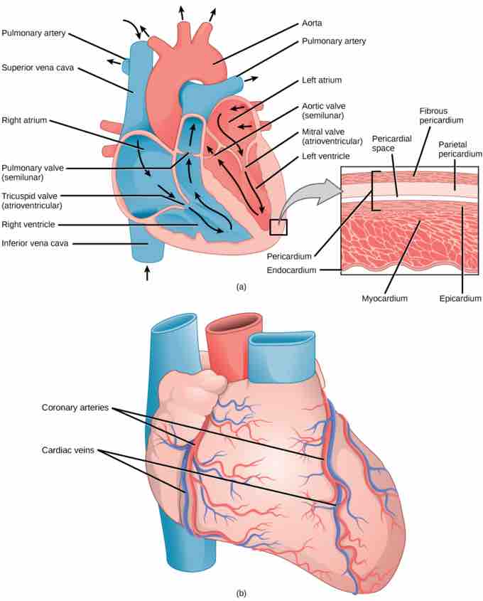 (a) The heart is primarily made of a thick muscle layer, called the myocardium, surrounded by membranes. One-way valves separate the four chambers. (b) Blood vessels of the coronary system, including the coronary arteries and veins, keep the heart muscles oxygenated.