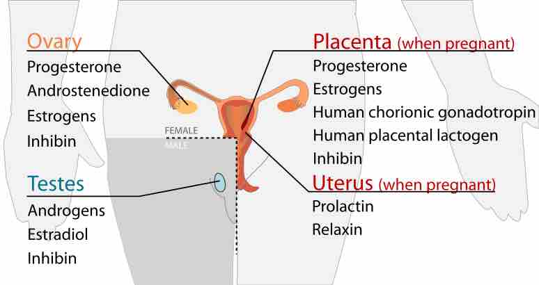 The gonads are the sex organs. Male testes produce androgens, while female ovaries produce estrogen and progesterone.