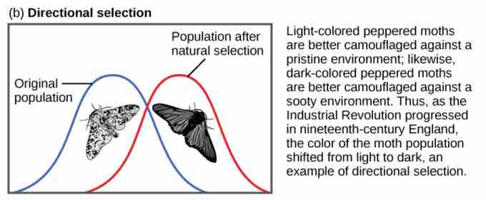 A classic example of this type of selection is the evolution of the peppered moth in eighteenth- and nineteenth-century England. Prior to the Industrial Revolution, the moths were predominately light in color, which allowed them to blend in with the light-colored trees and lichens in their environment. As soot began spewing from factories, the trees darkened and the light-colored moths became easier for predatory birds to spot.