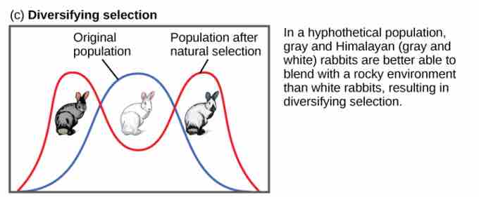 Diversifying selection can also occur when environmental changes favor individuals on either end of the phenotypic spectrum. Imagine a population of mice living at the beach where there is light-colored sand interspersed with patches of tall grass. In this scenario, light-colored mice that blend in with the sand would be favored, as well as dark-colored mice that can hide in the grass. Medium-colored mice, on the other hand, would not blend in with either the grass or the sand and, thus, would more probably be eaten by predators. The result of this type of selection is increased genetic variance as the population becomes more diverse.