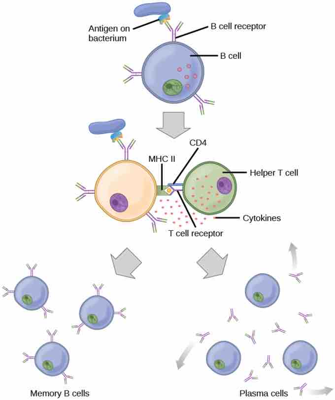 After initially binding an antigen to the B cell receptor (BCR), a B cell internalizes the antigen and presents it on MHC II. A helper T cell recognizes the MHC II–antigen complex and activates the B cell. As a result, memory B cells and plasma cells are made.