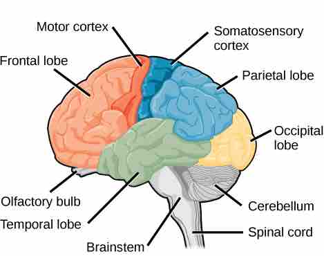 Each hemisphere of the mammalian cerebral cortex can be broken down into four functionally- and spatially-defined lobes: frontal, parietal, temporal, and occipital . The frontal lobe is located at the front of the brain, over the eyes. This lobe contains the olfactory bulb, which processes smells. The frontal lobe also contains the motor cortex, which is important for planning and implementing movement. Areas within the motor cortex map to different muscle groups; there is some organization to this map . For example, the neurons that control movement of the fingers are next to the neurons that control movement of the hand. Neurons in the frontal lobe also control cognitive functions such as maintaining attention, speech, and decision-making. Studies of humans who have damaged their frontal lobes show that parts of this area are involved in personality, socialization, and assessing risk.