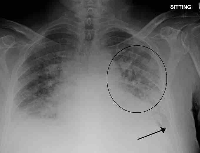 A physiological shunt can develop if there is infection or edema in the lung which decreases ventilation, but does not affect perfusion; thus, the ventilation/perfusion ratio is affected. Pulmonary edema with small pleural effusions on both sides (as shown) can cause changes in the V/Q ratio.