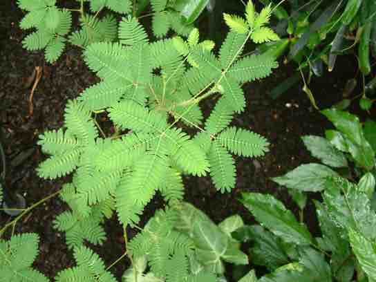 The leaves of this sensitive plant (Mimosa pudica) will instantly droop and fold when touched. After a few minutes, the plant returns to normal.