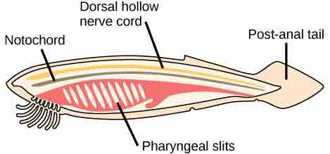 In chordates, four common features appear at some point during development: a notochord, a dorsal hollow nerve cord, pharyngeal slits, and a post-anal tail.