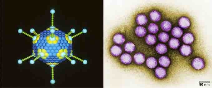 Adenovirus (left) is depicted with a double-stranded DNA genome enclosed in an icosahedral capsid that is 90–100 nm across. The virus, shown clustered in the micrograph (right), is transmitted orally and causes a variety of illnesses in vertebrates, including human eye and respiratory infections.
