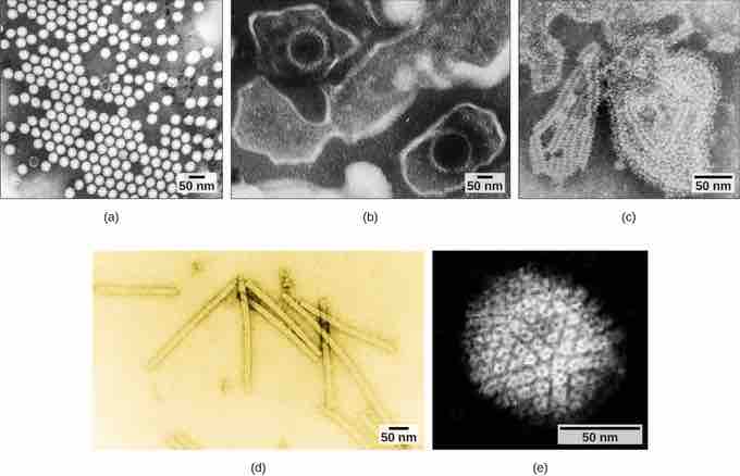 Transmission electron micrographs of various viruses show their structures. The capsid of the (a) polio virus is naked icosahedral; (b) the Epstein-Barr virus capsid is enveloped icosahedral; (c) the mumps virus capsid is an enveloped helix; (d) the tobacco mosaic virus capsid is naked helical; and (e) the herpesvirus capsid is complex.