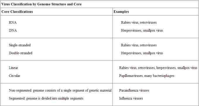 The type of genetic material (DNA or RNA) and its structure (single- or double-stranded, linear or circular, and segmented or non-segmented) are used to classify the virus core structures.