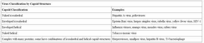 Viruses can also be classified by the design of their capsids which are classified as naked icosahedral, enveloped icosahedral, enveloped helical, naked helical, and complex.