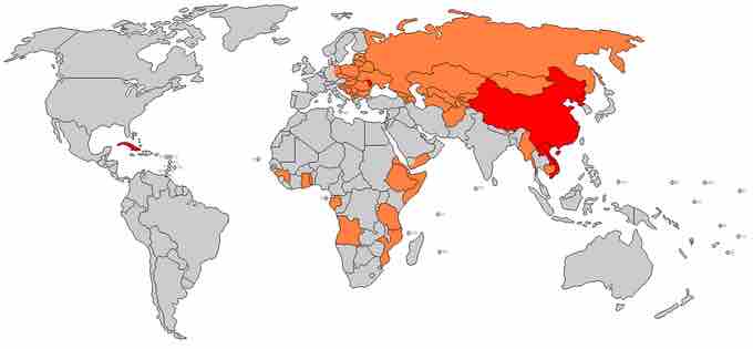 Formerly titled socialist states, led by communists (whether that be in title or in fact) are represented in orange, currently titled socialist states are represented in red. It is of heavy dispute whether there are any actual socialist or genuinely communist led states in the world today.