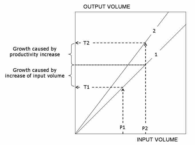 The performance of production measures production's ability to generate income. There are two components in income growth due to performance: the income growth caused by an increase in production volume and the income growth caused by an increase in productivity. The income growth caused by increased production volume is determined by moving along the production function graph. The income growth corresponding to a shift of the production function is generated by the increase in productivity. The change of real income signifies a move from Point 1 to Point 2 on the production function . When we want to maximize the production performance, we have to maximize the income generated by the production function.