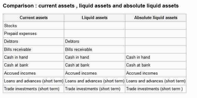 Current assets vs. liquid assets vs. absolute liquid assets.