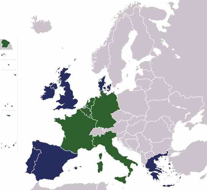 The six states that founded the EEC and the other two communities were known as the "inner six" (the "outer seven" were those countries who formed the European Free Trade Association). The six were France, West Germany, Italy, and the three Benelux countries: Belgium, the Netherlands, and Luxembourg. The first enlargement was in 1973, with the accession of Denmark, Ireland, and the United Kingdom. Greece, Spain, and Portugal joined in the 1980s. Following the creation of the EU in 1993, it has enlarged to include an additional 15 countries by 2007.