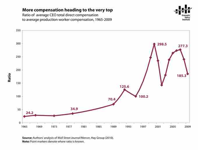 The compensation of CEOs in the United States has risen to over 400 times the salary of the average U.S. worker, compared to about 30 times only a few decades ago.